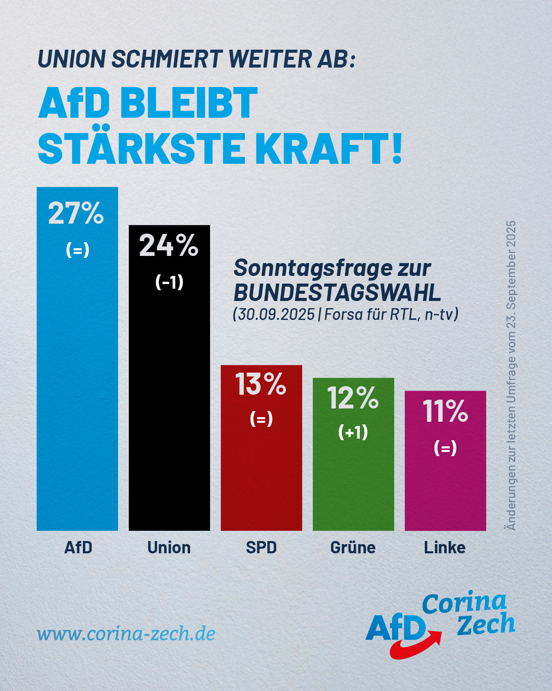 In der aktuellen Forsa-Sonntagsfrage für RTL und n-tv verliert die Union erneut einen Punkt und kommt nur noch auf 24 Prozent. Damit liegt sie deutlich hinter der AfD, die mit 27 Prozent stärkste Kraft bleibt.